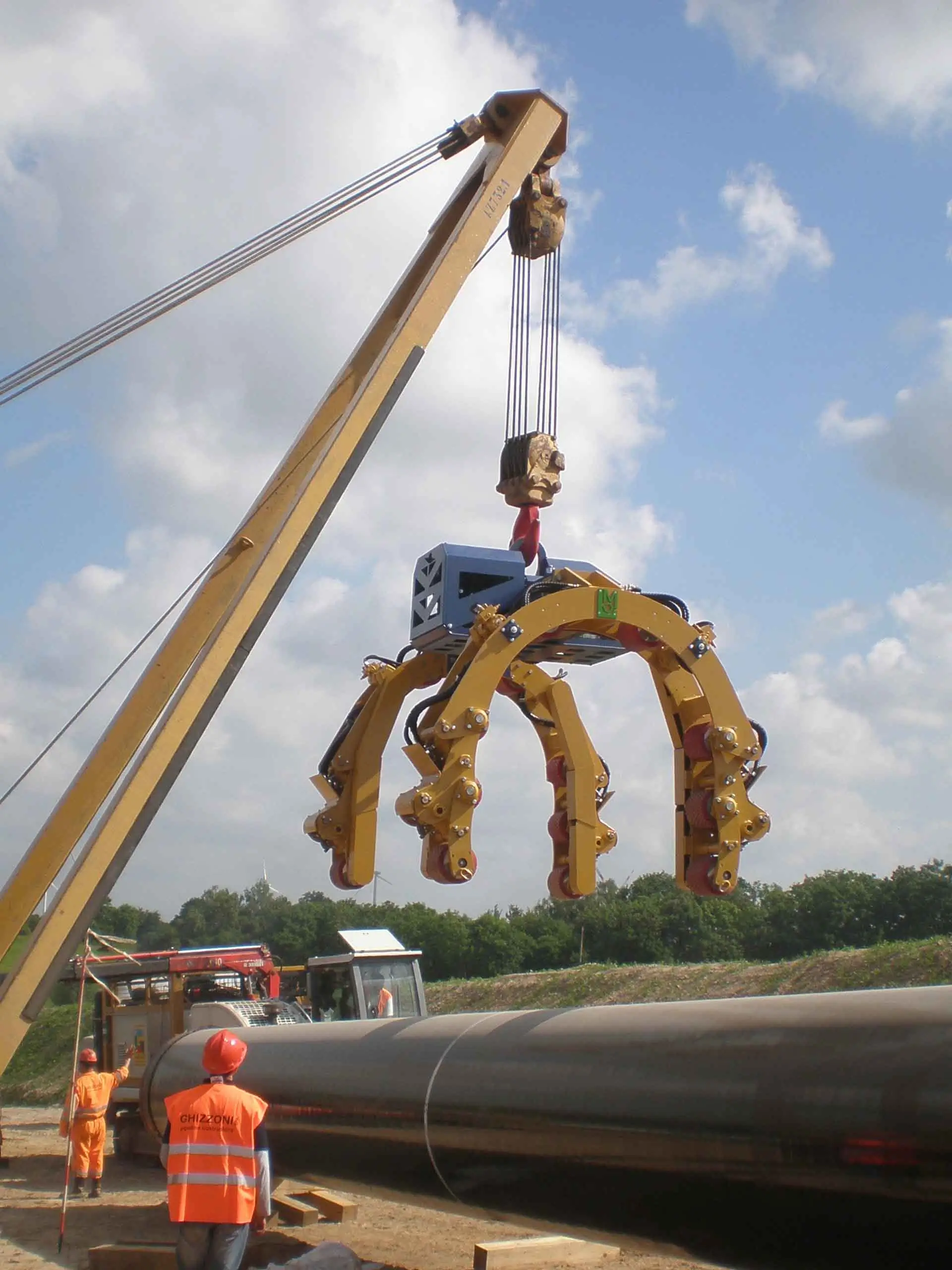Before joint welding, project specifications require that the longitudinal weld of the pipe has a specific angular distance relative to the previous pipe. The Seam Aligner clamp allows for quick, precise, and safe positioning of the pipe, even with bent pipes that have angular inertia. The Seam Aligner is a clamp composed of 4 radio-controlled hydraulic arms equipped with 12 polyurethane-coated rollers that wrap around the pipe. The clamp is secured by safety lock valves on the hydraulic circuit. After closing the clamp around the pipe, the operator uses the remote control to rotate the pipe clockwise or counterclockwise until the longitudinal weld of the pipe reaches the desired position relative to the previous pipe section.