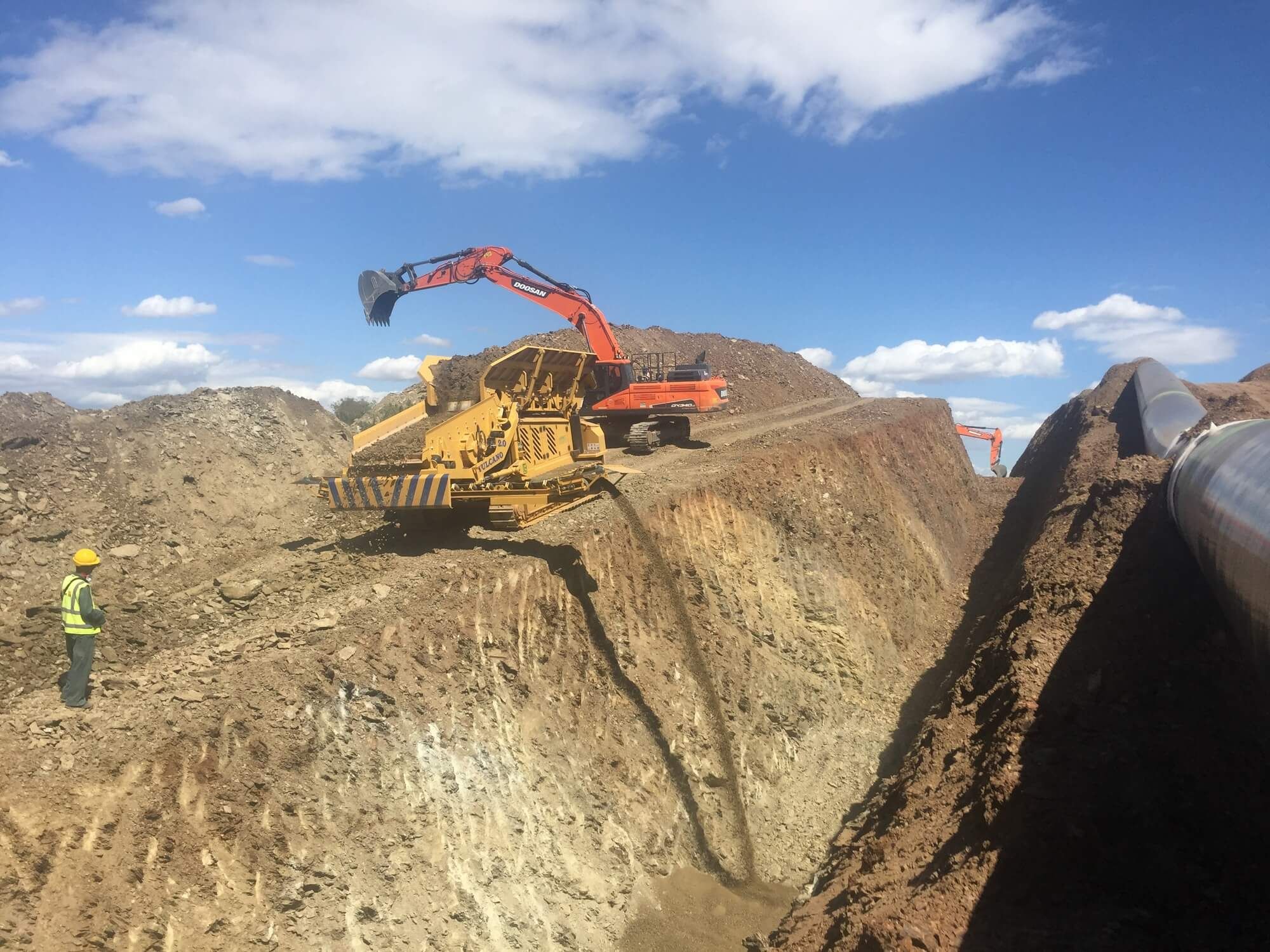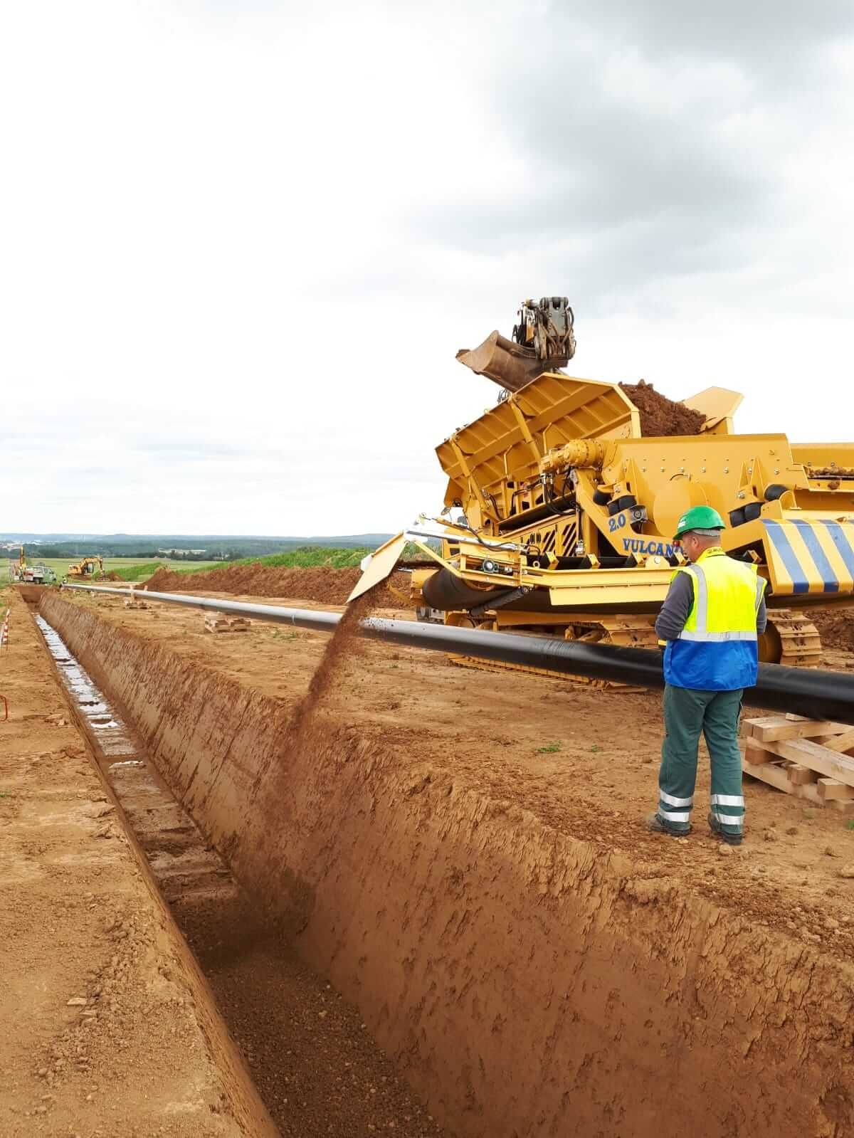 Vulcano 2.0 is the best-selling radio-controlled mobile screener, to be loaded with an excavator, in the Pipeline world. The screener mesh is interchangeable, and the plate feeder, with adjustable speed, allows optimal material flow management. The conveyor belt, which deposits the fine material directly into the trench, is retractable to direct the material into the excavation and foldable to facilitate transport. These features, combined with its high reliability, make Vulcano 2.0 an extremely versatile solution, suitable for different types of terrain and adaptable to multiple track configurations.
