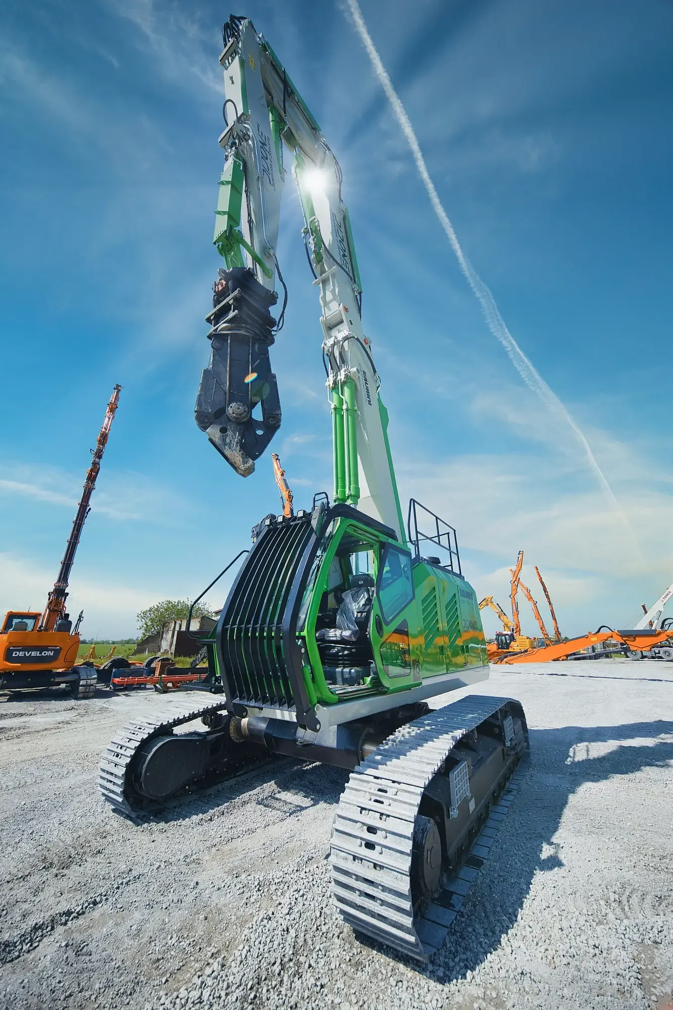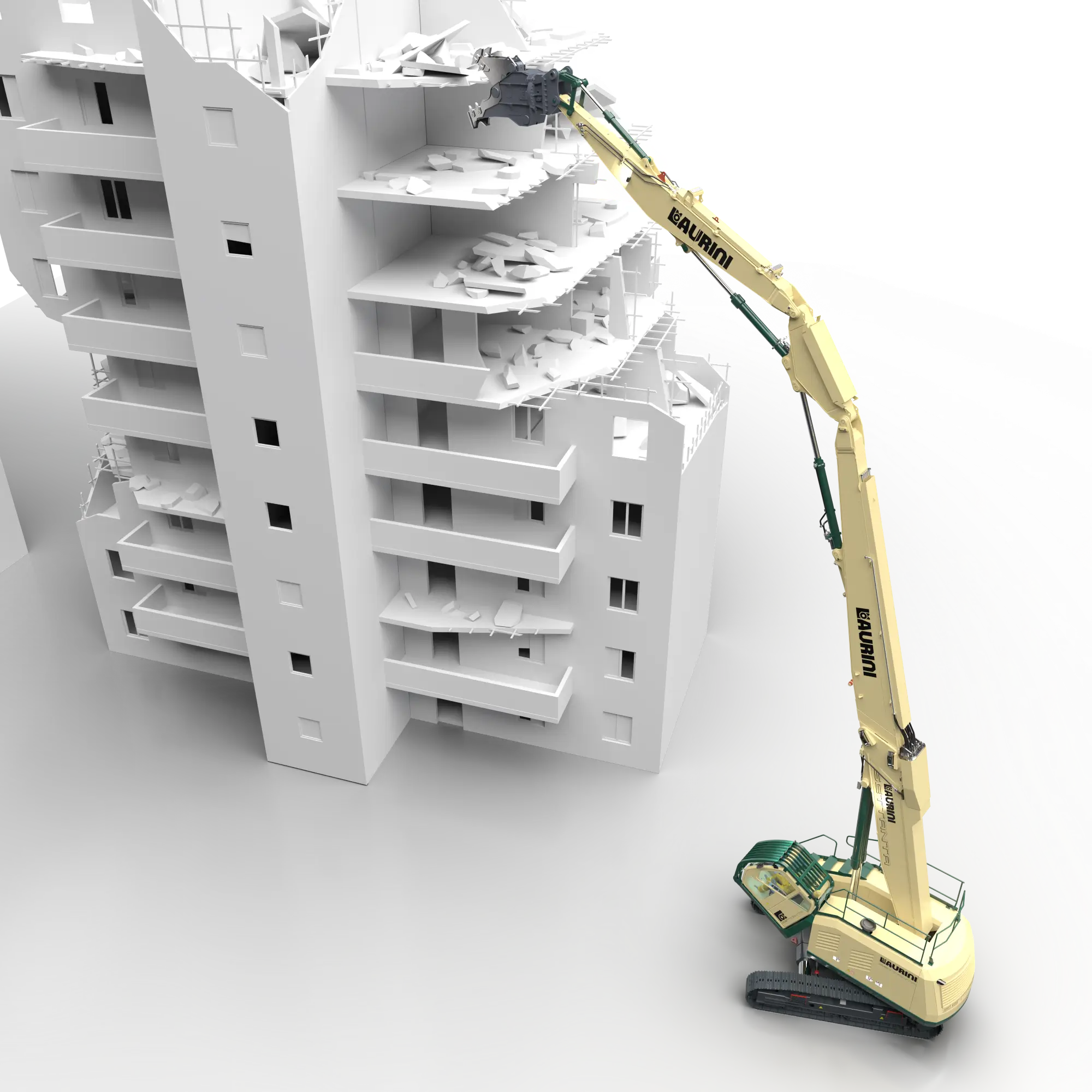 - Braccio da demolizione con un’altezza di 24,5 metri al perno e utensile da 3.000 kg;