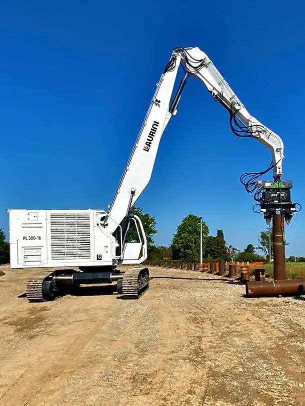 Le macchine per piantare palancole sono sempre state realizzate modificando escavatori. Anche in questo caso, abbiamo ritenuto che realizzare una macchina dedicata per questo utilizzo abbia diversi vantaggi: un motore con potenza adeguata e pompa dedicata al vibroinfissore, facile trasportabilità per pesi e ingombri ridotti, sottocarro allargabile idraulicamente e braccio progettato su misura.