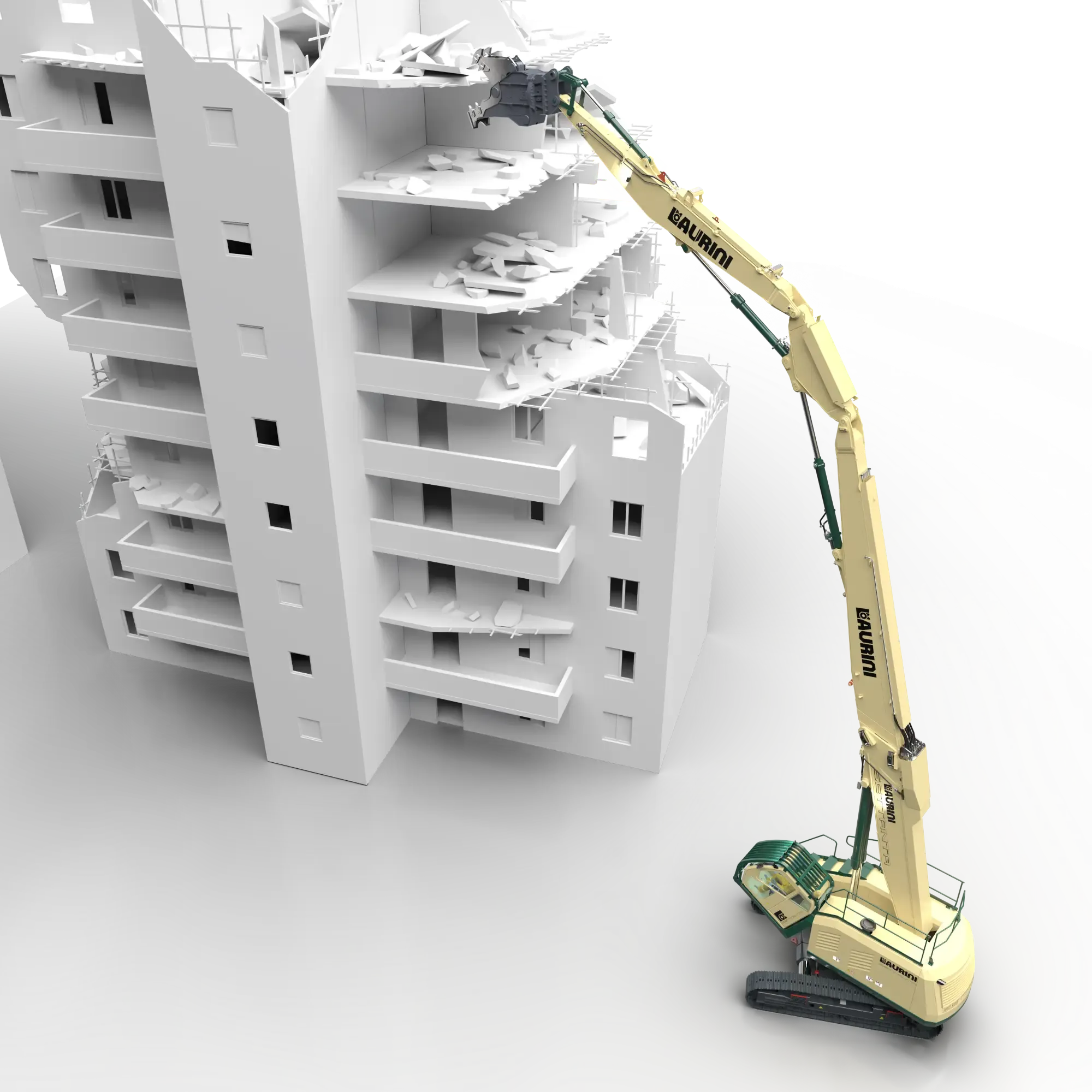 - Braccio da demolizione con un’altezza di 24,5 metri al perno e utensile da 3.000 kg;